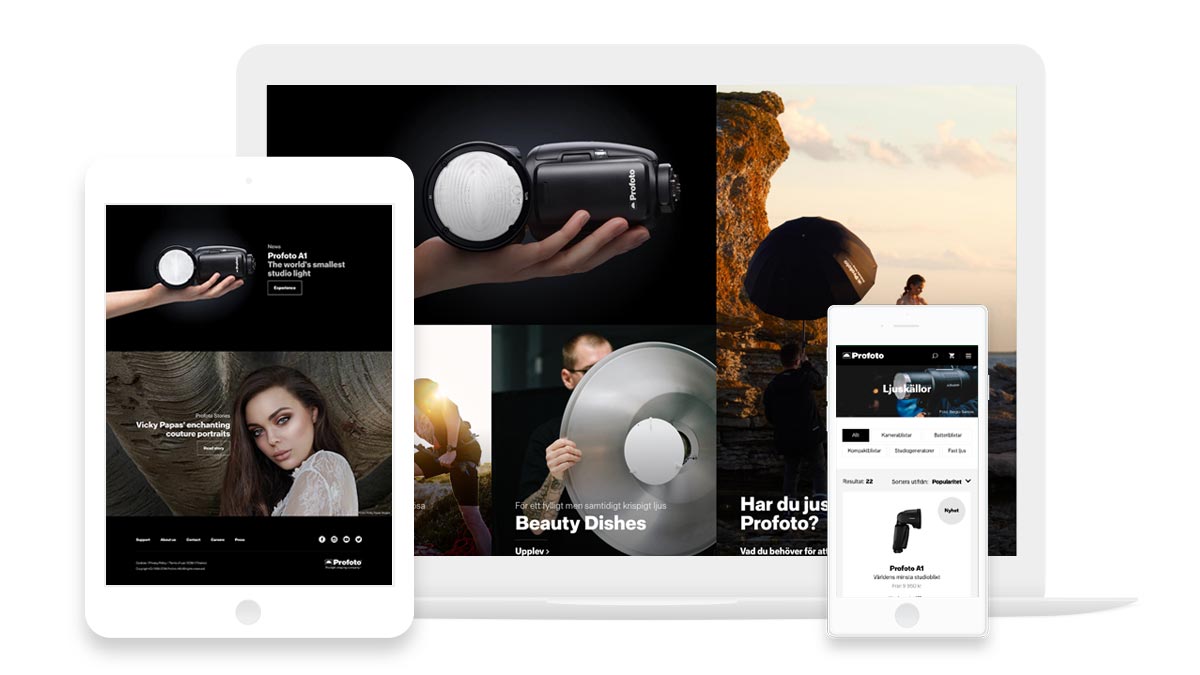 A marketing automation system is integrated in the platform to enable targeted and effective communication. Images and specifications for all customer products are handled in a PIM solution which is integrated with the web solution. Now Profoto can promote sales and the use of their products in a context of world-class visual experiences and storytelling that is guided by the Profoto site in a section called Profoto Stories.